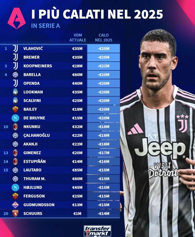 德国进入2025年意甲身价跌幅榜:尤文跻身前三,DV9跌幅最大2500万美元
